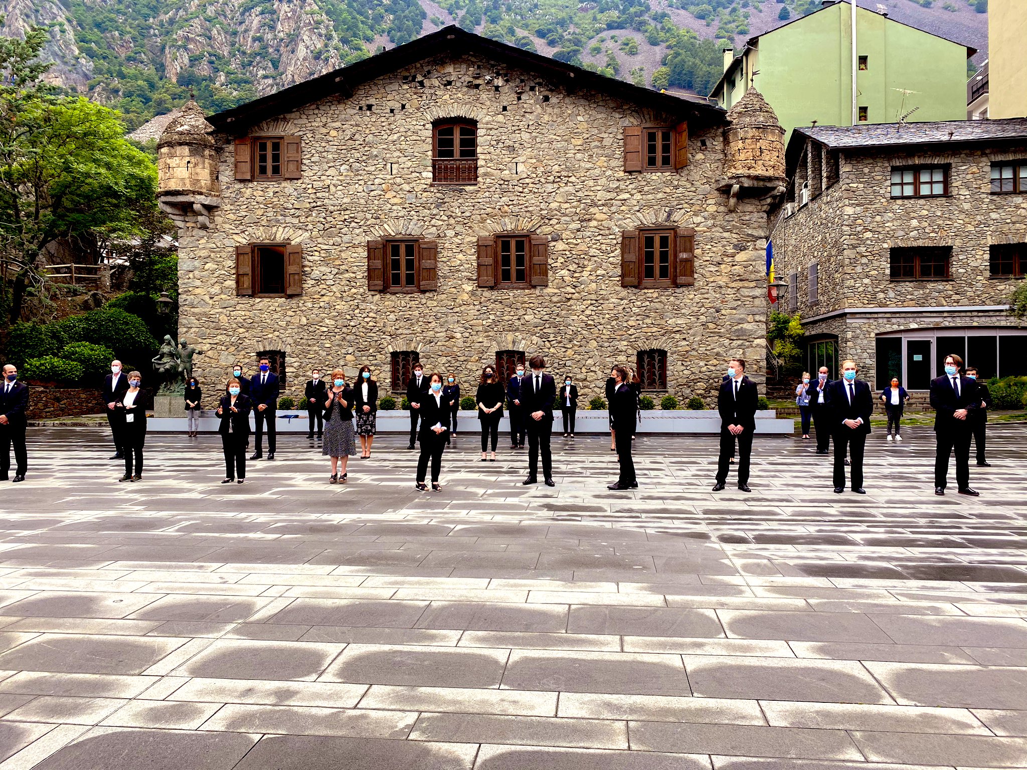 Institucions i entitats de diferents àmbits i d’arreu del país s’han sumat a la convocatòria de guardar un minut de silenci a les dotze del migdia en memòria de les 51 víctimes mortals que l’epidèmia de coronavirus ha deixat al país i en suport a les seves famílies i amics. La plaça Lídia Armengol ha estat un dels punts neuràlgics de la convocatòria, que posa fi als tres dies de dol decretats pel Govern, perquè sota les silencioses figures dels Set Poetes de Plensa s’han aplegat els representants de les associacions de gent gran de les set parròquies, un dels col•lectius més castigats per la pandemia.