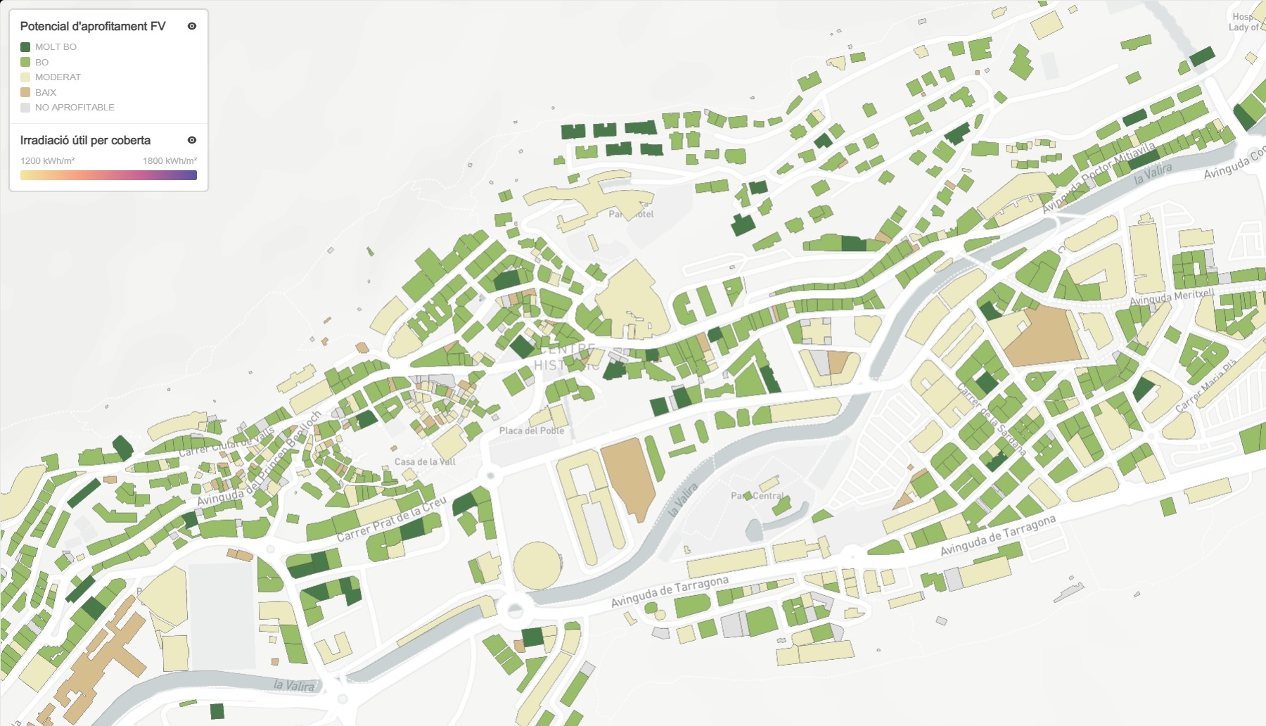 Els mapes que en l’actualitat pot consultar la ciutadania a través del web potencial.solar mostren dues coses. D’una banda, la irradiació útil per coberta, amb el consegüent potencial de generació elèctrica. De l’altra, el potencial d’aprofitament fotovoltaic que, a banda del càlcul anterior sobre la producció estimada d’electricitat per a cada coberta, té en compte altres indicadors: costos d’instal·lació i manteniment, ingressos per l’electricitat que s’injecta a la xarxa, estalvi a la factura de la llum i període de retorn de la inversió. Així mateix, també es calculen els beneficis ambientals, bàsicament l’estalvi d’emissions de CO2 i l’equivalència de la producció elèctrica en nombre d’habitatges. Aquest altre valor, el del potencial d’aprofitament fotovoltaic amb un rang que va de “no aprofitable” a “molt bo”, és el que permet veure allà on pot ser “més interessant” plantejar-se una instal·lació fotovoltaica, segons apunta el coordinador de Sostenibilitat de l’ARI, Oriol Travesset.