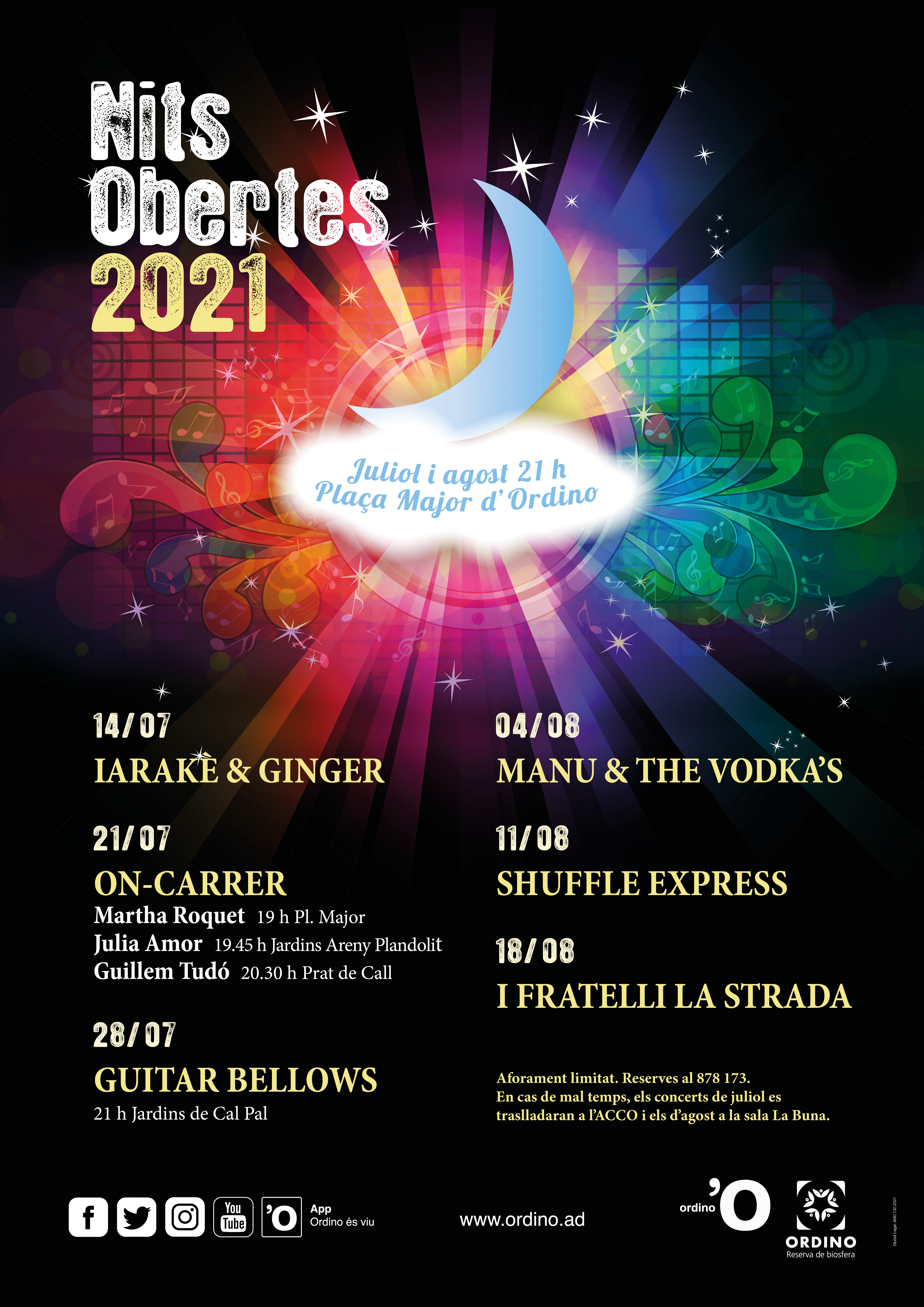Les Nits Obertes seguiran el mes d’agost amb el rockabilly de Manu & The Vodka’s (4 d’agost) i la banda de blues Shuffle Express (11 d’agost). I Fratelli La Strada, establerts a Itàlia amb la violinista i cantant Ana Galba, andorrana, tancaran el programa el 18 d’agost. Les darreres edicions de les Nits Obertes han estat una clara aposta pel talent local amb els músics del país com a protagonistes. La proposta sorgeix per atraure el públic al carrer amb el bon temps i dinamitzar la restauració i els bars del poble d’Ordino que omplen les terrasses amb el públic assistent. Les Nits Obertes han estat una de les poques activitats que es van mantenir l’estiu passat malgrat la pandèmia. L’aforament serà limitat i caldrà fer reserva prèvia al 878 173. En cas de mal temps, els concerts de juliol es traslladarien a l’ACCO i els del mes d’agost a la sala La Buna.