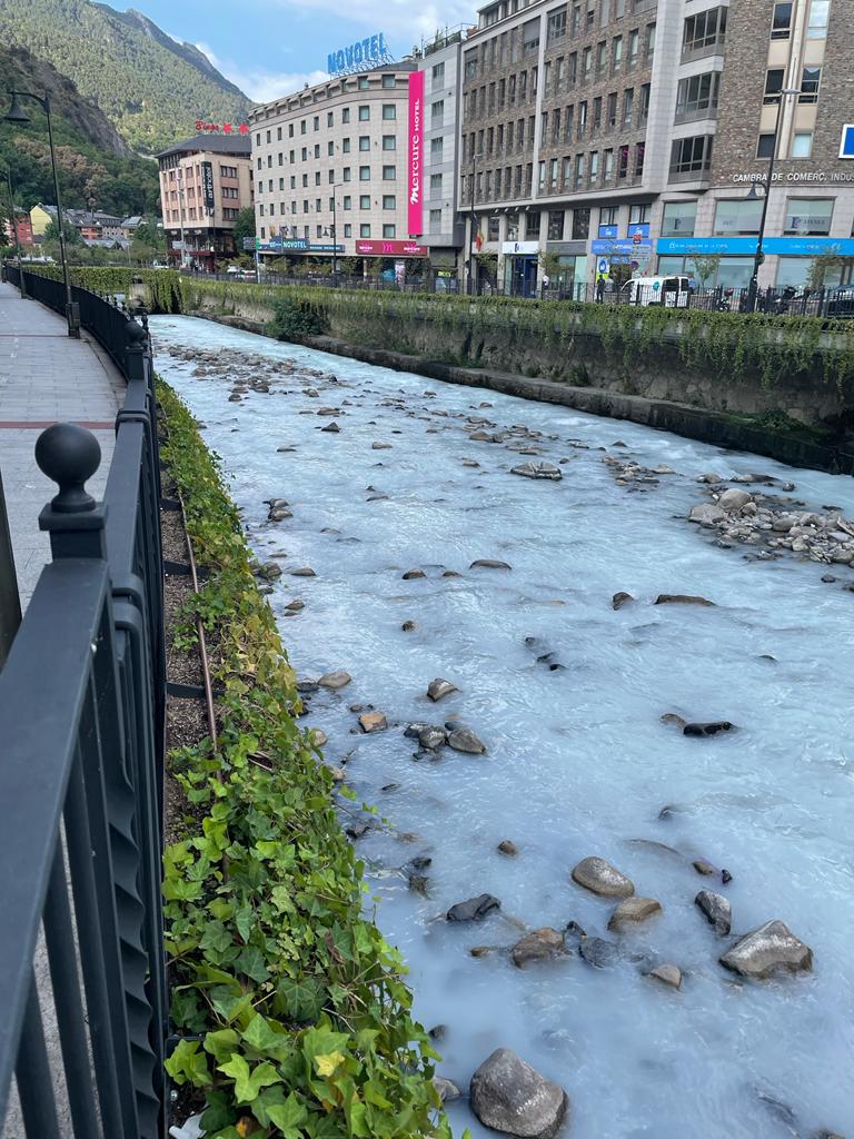 Un abocament d'origen desconegut ha tenyit aquest matí el Valira de blanc i ha generat sorpresa i certa alarma entre els vianants. Tanta, que ha sigut un avís ciutadà a la bústia de denúncies de Medi ambient la que ha activat els protocols del ministeri, que ha enviat un equip de tècnics per prendre'n mostres, analitzar la composició del vessament, probablement un producte químic, i intentar determinar-ne l'origen.