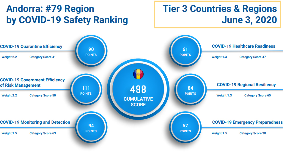 Andorra ocupa el lloc 79 en el rànquing que avalua la seguretat dels països en relació amb la Covid-19 elaborat pel consorci d’empreses sense ànim de lucre Deep Knowledge Group, un estudi que dissenyat per analitzar i classificar l’estabilitat econòmica, social i sanitària assolida per 200 regions, països i territoris, així com els punts forts, els punts febles, les oportunitats i les amenaces o riscos que tenen i s’enfronten contra la crisi econòmica i sanitària global desencadenada per la Covid-19.