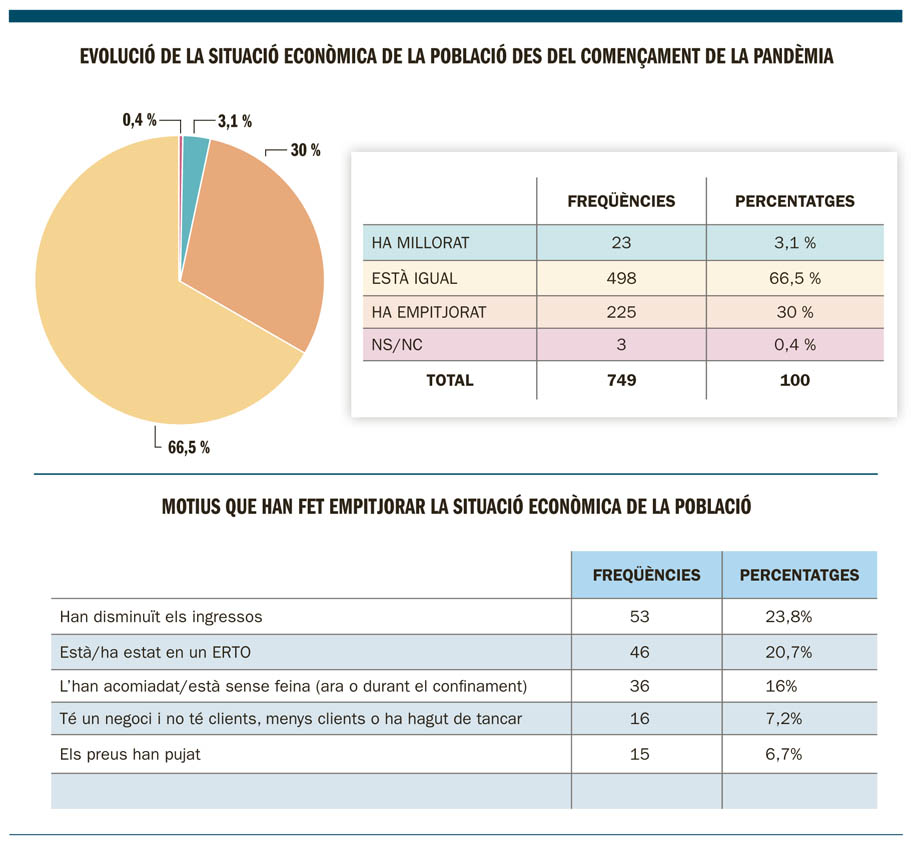 La situació econòmica del 30% de la població ha empitjorat des de l’esclat de la pandèmia de coronavirus. Aquest empobriment ve motivat principalment perquè la ciutadania ha vist reduïts els ingressos (23,8%), perquè ha estat o encara està en un ERTO (20,7%) o perquè està a l’atur (16%). Aquestes dades són fruit de l’Observatori postconfinament realitzat pel CRES. L’enquesta també exposa que el 38% de les persones que han vist caure els ingressos diuen que la reducció ha estat ni més ni menys d’entre el 20% i el 50%, mentre que un altre 30% diu que ha estat del 20%.