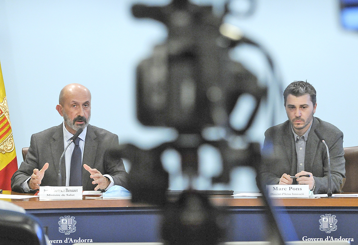 El titular de Salut va comparèixer acompanyat del director d’Actua Innovació, Marc Pons, per tal de detallar una mica l’operatiu previst per a la realització dels tests d’anticossos a tota la població, prova a la qual ja s’han inscrit fins ara més de 44.000 ciutadans. En aquest sentit, el ministre i Pons, que van recordar que cal inscriure’s a https://coronavirus.govern.ad, van explicar que aquells ciutadans que no hagin pogut fer aquest registre previ a la plataforma digital poden inscriure’s també al seu Comú corresponent, on també hauran de contactar els temporers, mentre als treballadors transfronterers se’ls registrarà telefònicament.