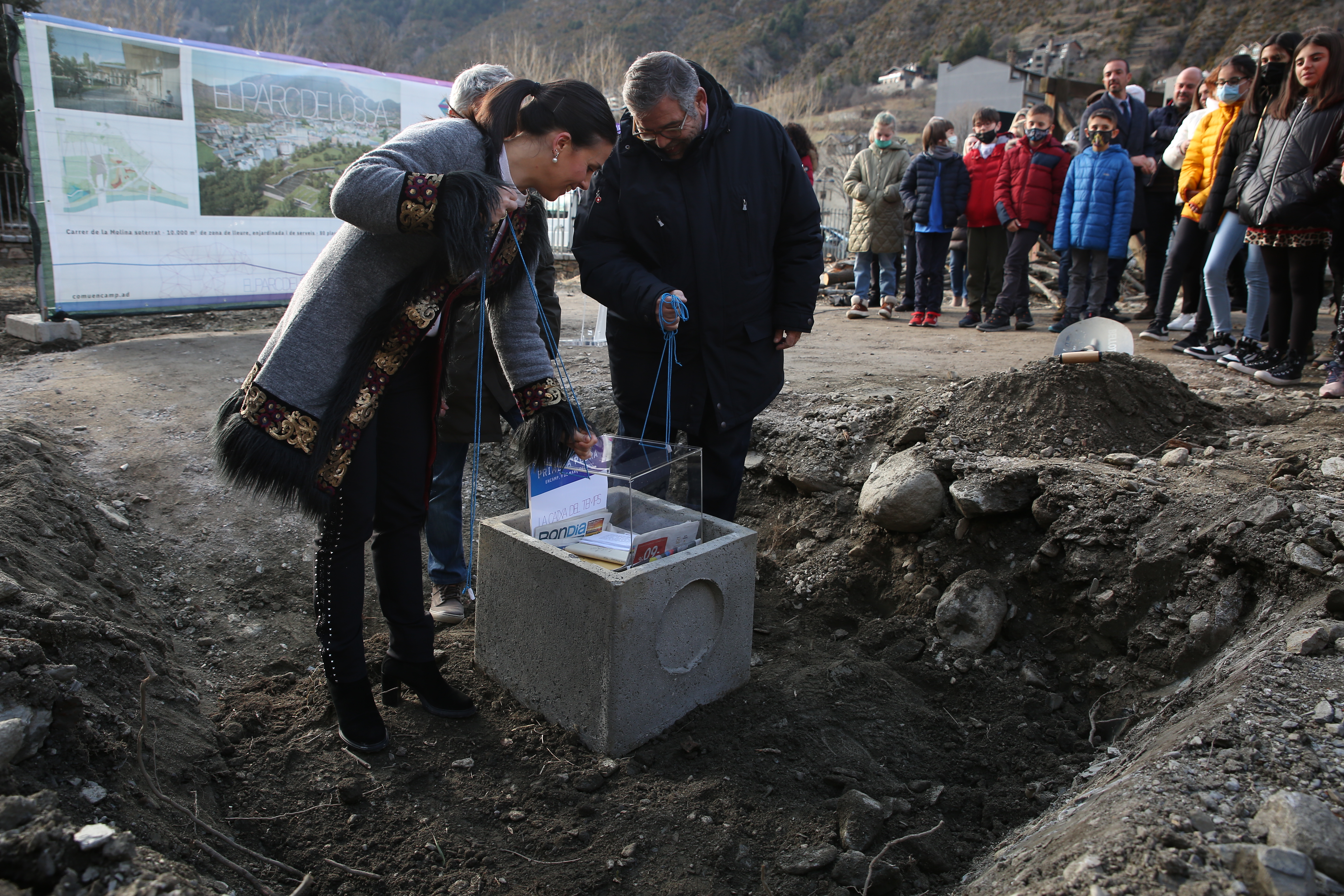 Un dels moments més simbòlics de l'acte ha estat, tal com ha posat de manifest la mandatària, la col·locació d'una caixa del temps a la primera pedra de la construcció, una iniciativa que "ens feia molta il·lusió i en la qual volíem que hi participessin totes aquelles persones i entitats que han fet possible aquest projecte". Així doncs, des dels membres del consell d'infants d'Encamp fins als propietaris del terreny, han tingut la possibilitat de dipositar a l'interior d'una urna diversos estris, objectes i diaris, per donar un caire "especial" a l'inici de les obres.
