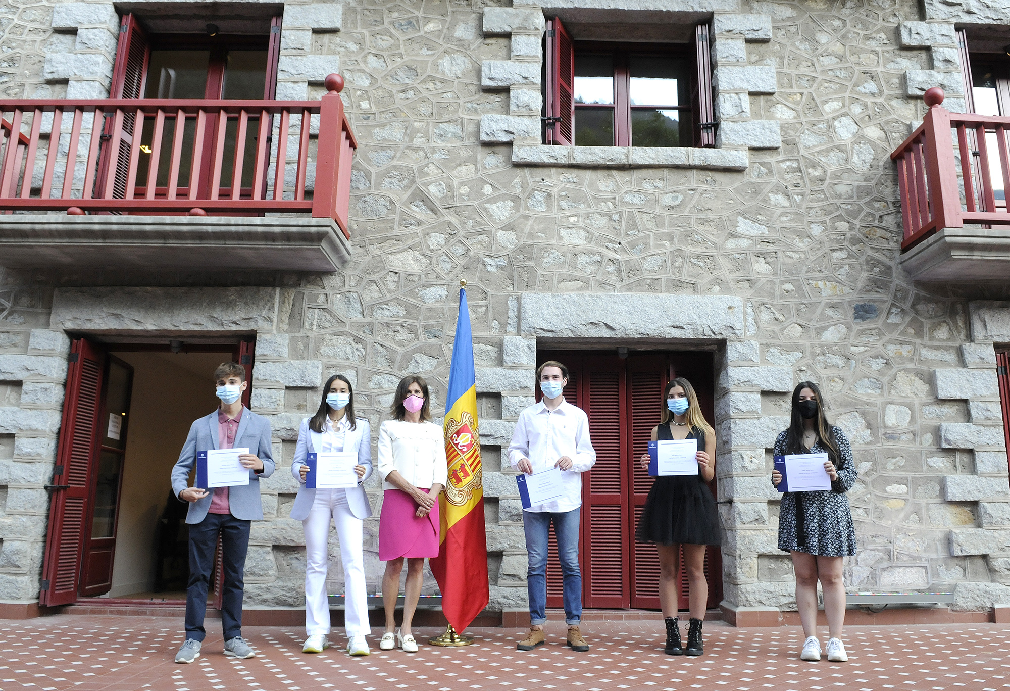 L’entrega del diploma a millor estudiant s’ha dut a terme al ministeri de Cultura, a l’antic Hotel Rosaleda. Es tracta d’un reconeixement que s’atorga als millors estudiants de batxillerat i batxillerat professional dels tres sistemes educatius, en un any marcat per la crisi de la Covid-19. Els guardonats han estat Fernando Muñoz, de l’escola andorrana de Batxillerat; Inés Higueros, del Centre de Formació Professional; Sara Miño, de l’Agora International School; David Fernandes, del Lycée Comte de Foix, i Tiffany Botelho, també del Lycée. El Premi Nacional a l’Estudi, a banda del reconeixement, premia amb 3.000 euros als guanyadors i, a més, els subvenciona la matrícula íntegra del primer cicle d’estudis superiors.