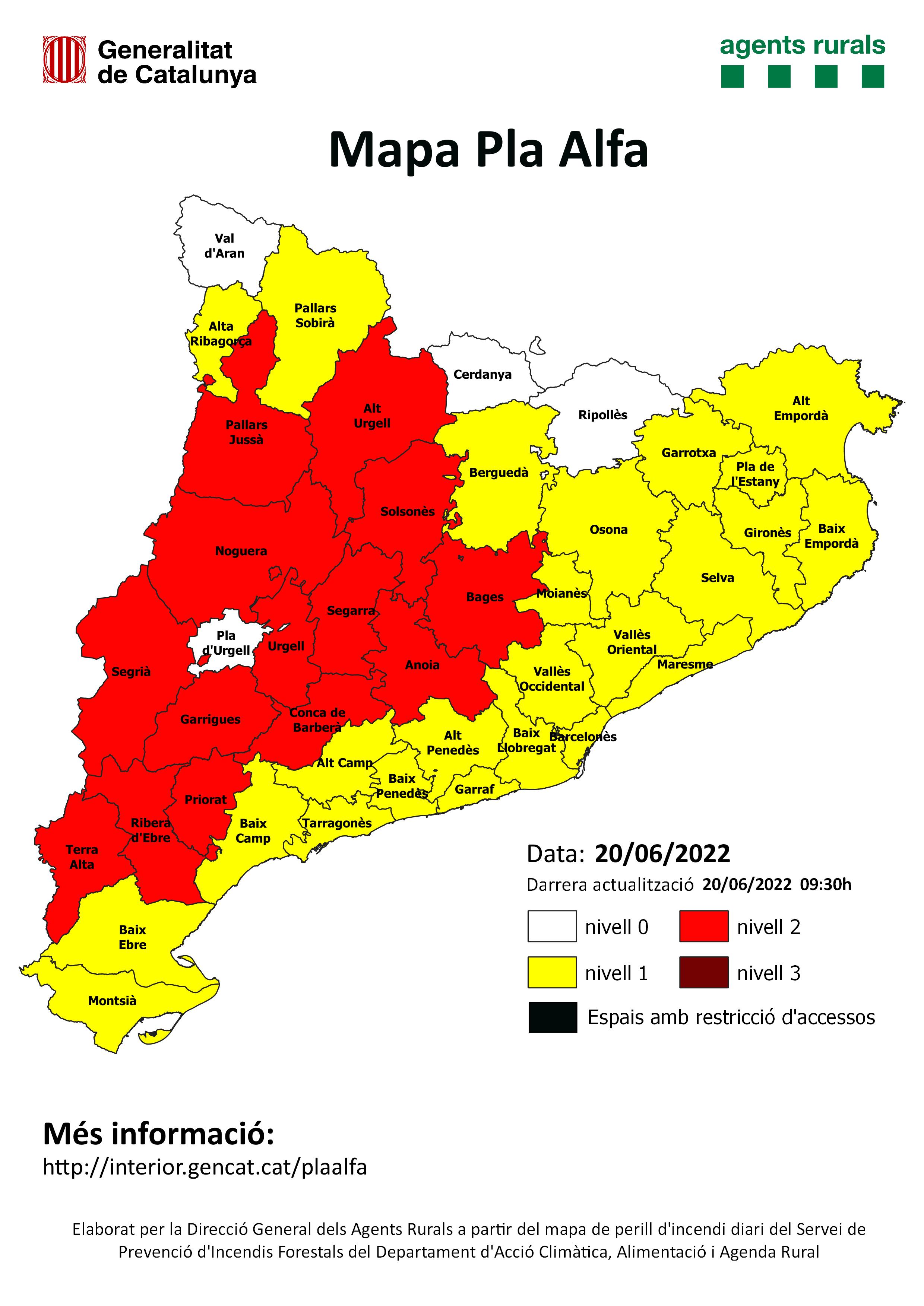 A hores d'ara, tota la comarca de l'Alt Urgell continua sota la consideració de nivell 3 de risc d'incendi del Pla Alfa.