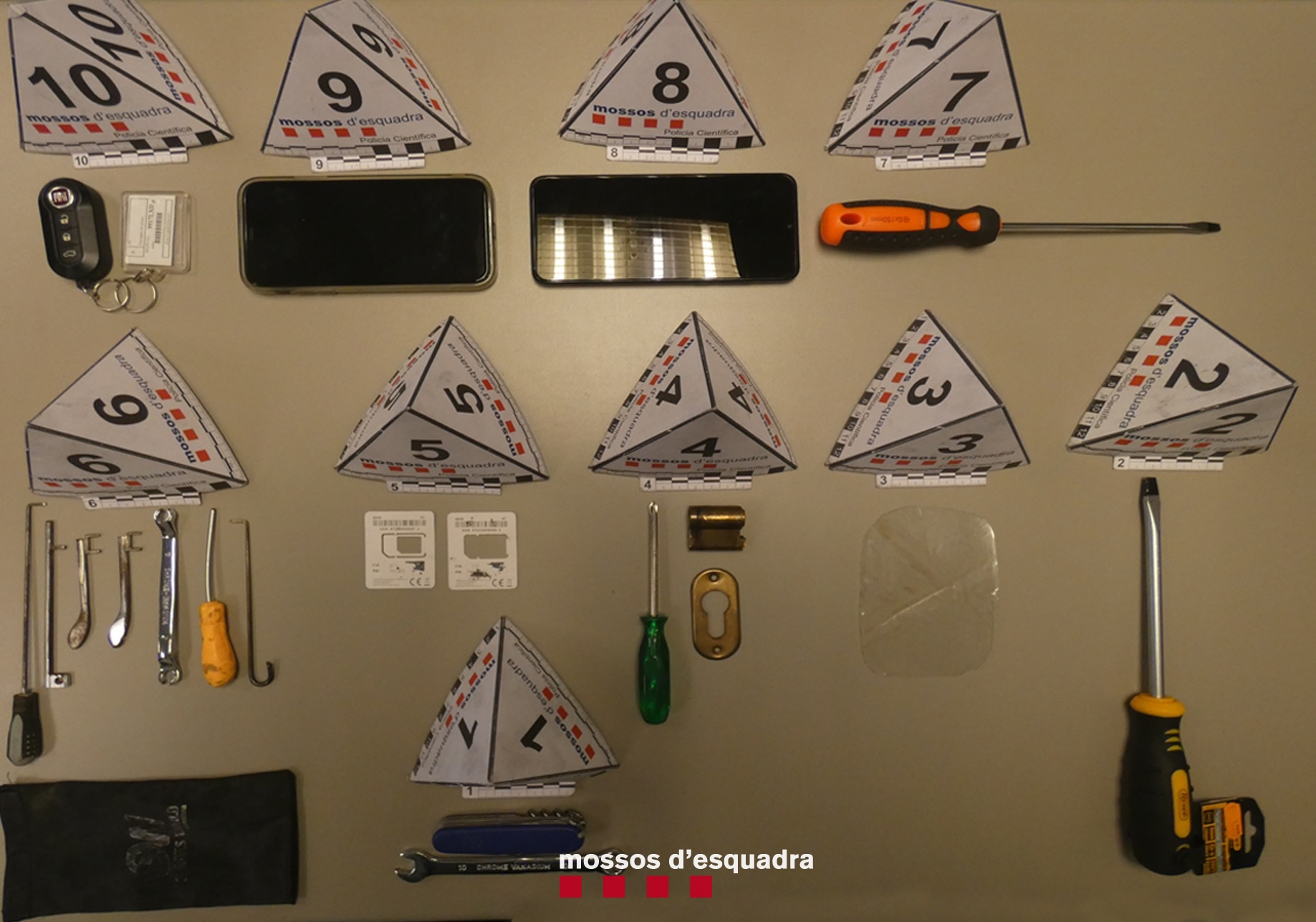 Abans de procedir a la seva detenció, els mossos van intentar parlar amb ells per si tenien relació amb els pisos, però no va ser possible per la barrera idiomàtica. Mentre estaven duent a terme comprovacions als pisos, una patrulla de la Policia Local va trobar al carrer, a sota d'una de les finestres del pis violentat, una bossa que contenia cinc rossinyols, un tornavís tipus punxó i claus tipus colze. Tot apunta que en veure's sorpresos, un d'ells hauria llençat per la finestra la bossa amb les eines.
