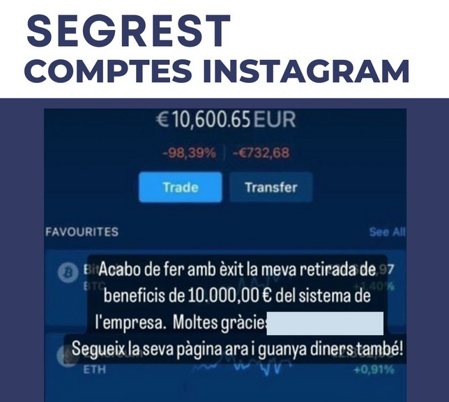 La policia ha tornat a alertar d'intents de segrest de comptes d'Instagram. Com fa uns mesos, el cos d'ordre alerta de missatges enganyosos en què un conegut explica que ha fet una inversió d'èxit amb criptomoneda i que ha guanyat diners ràpidament. Es tracta de missatges enganyosos que intenten segrestar el compte de la persona que hi respon. Per això, des de la policia recorden que és una estafa i que el que cal fer és eliminar el missatge sense fer-hi res més, ja que en cas contrari es pot perdre el compte d'Instagram i que els estafadors reclamin diners a canvi de poder-lo recuperar.