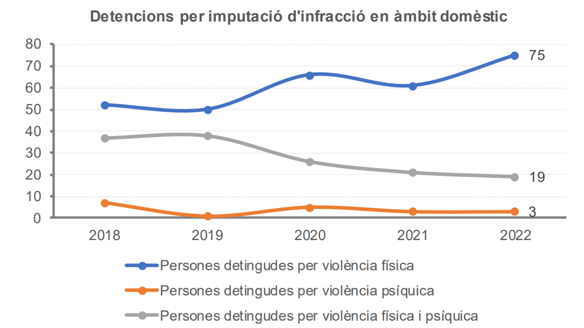 Aquest augment de les detencions contrasta amb la xifra total d’intervencions policials per requeriments telefònics d’àmbit domèstic, ja que la policia en va fer 838, només tres més que el 2021, el que suposa un 0,4% més de casos. D’aquestes actuacions, més de dos terços van ser per problemes en l’àmbit domèstic (589). Tot i que l’increment global és menor, van augmentar les intervencions per violència de gènere (61), en concret, un 38,6%, mentre que van disminuir notablement les actuacions per violència domèstica, un 40% menys que el 2021. També van disminuir un 10% les intervencions relacionades amb problemes per la custòdia de menors.