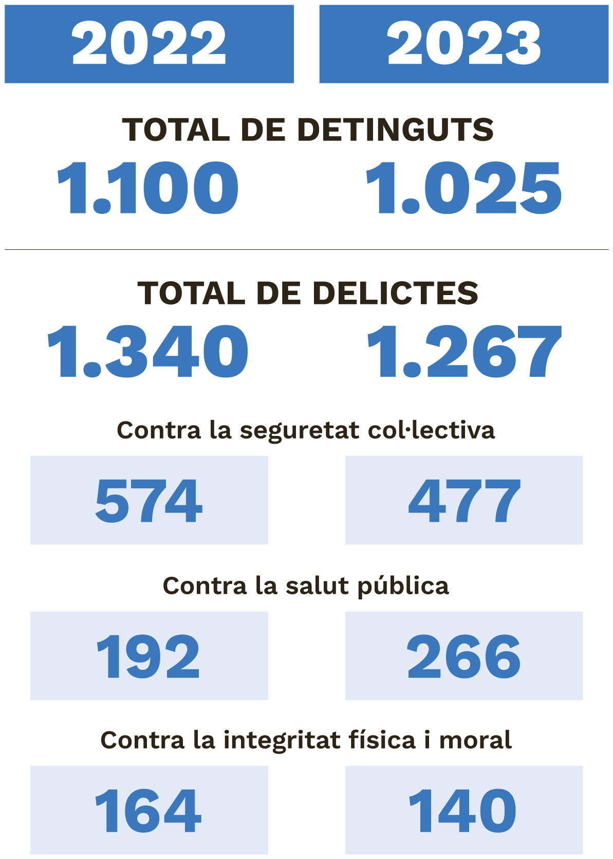 Si ens fixem en els delictes imputats als detinguts, s’ha de tenir en compte que algunes de les persones van ser privades de llibertat per més d’un delicte. Per aquest motiu, la xifra total és superior a la de detinguts. Així, el total de delictes imputats es queda en 1.267 el 2023, mentre que l’any anterior la xifra es va enfilar fins als 1.340.
