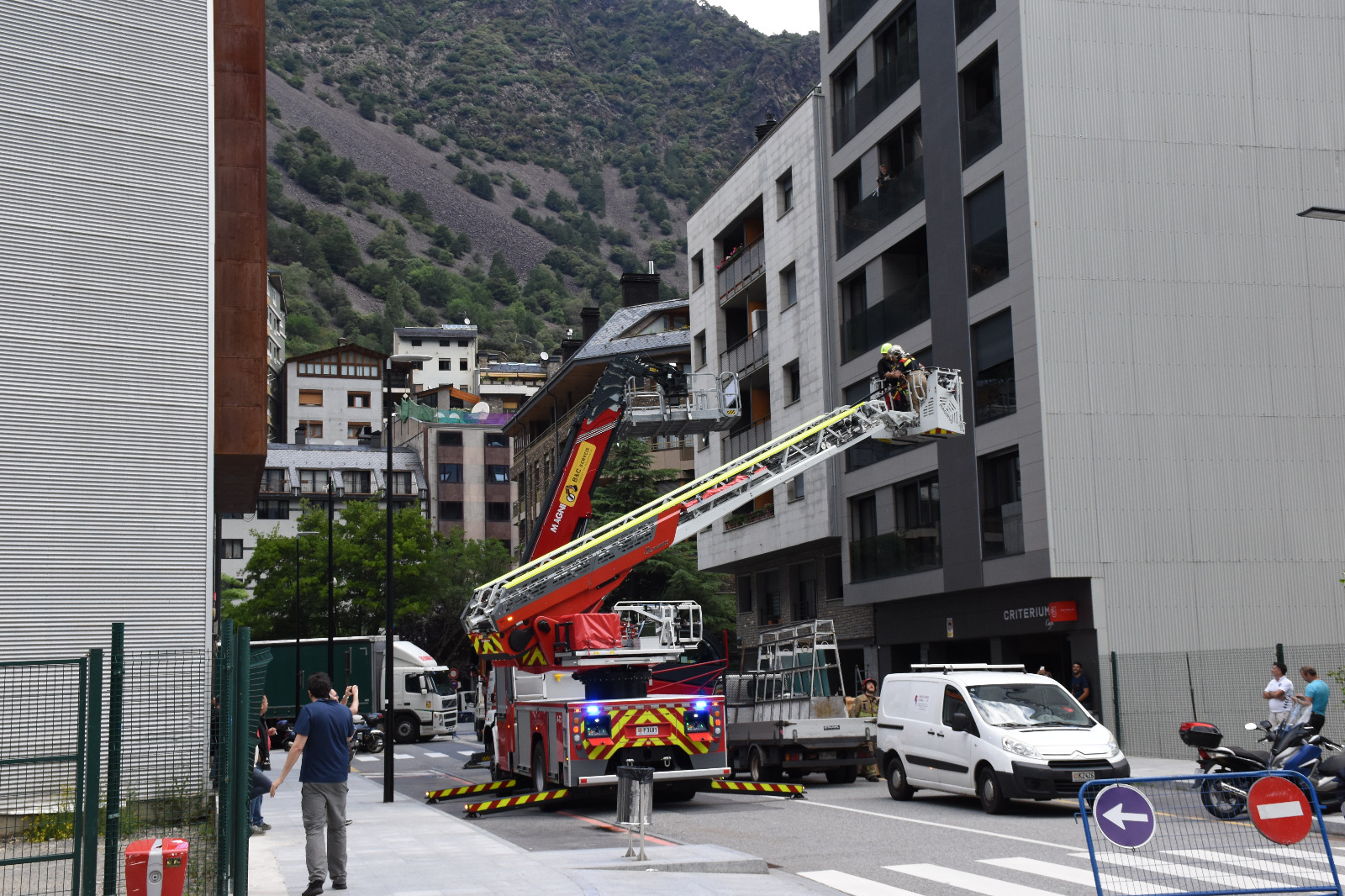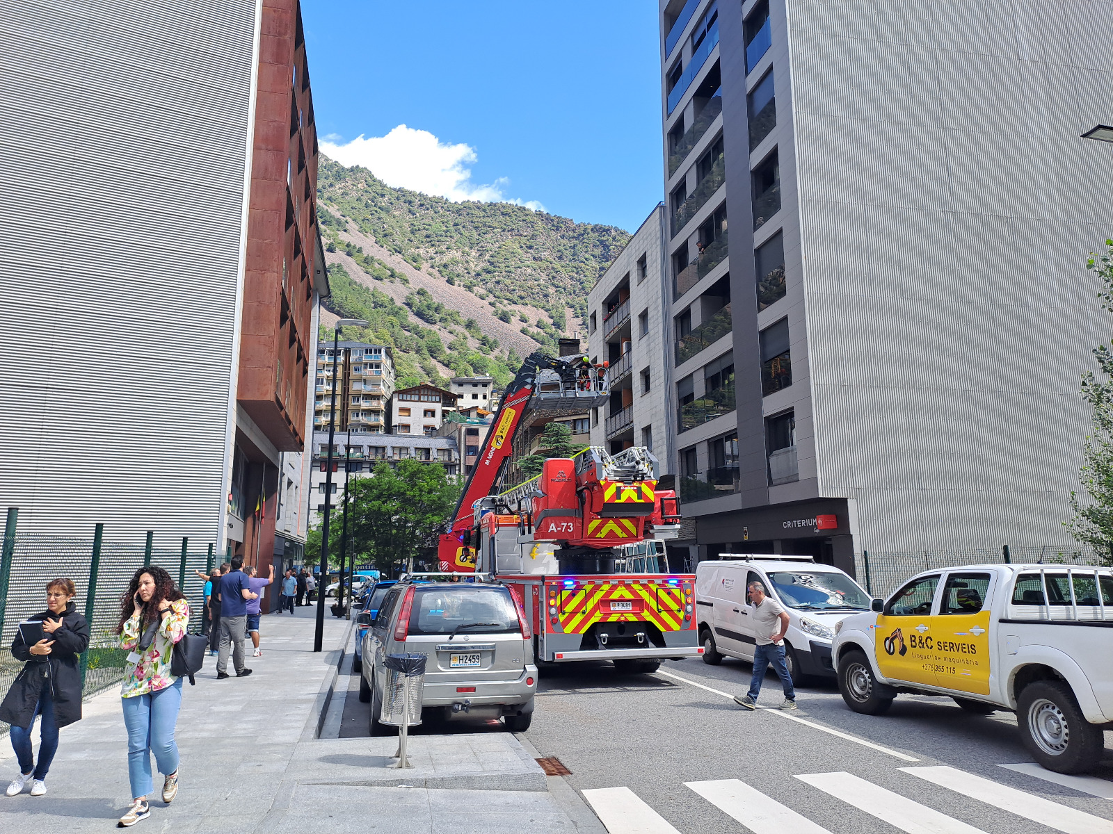 Els bombers amb un camió escala han accedit a la plataforma i han baixat els dos treballadors davant la mirada de curiosos i treballadors de les oficines properes i de l'edifici administratiu del Govern de Prat del Rull, ubicat just davant de l'immoble on s'estaven fent els treballs de mudança.