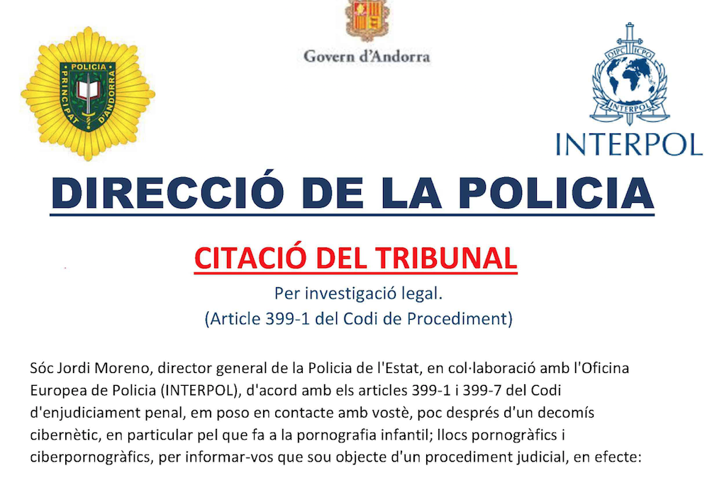 Diversos ciutadans estan tornant a rebre correus electrònics fraudulents suplantant la policia. Es tracta d'un succés que ja va ser denunciat per diversos usuaris fa unes setmanes a través de les xarxes socials. En el correu, els emissors envien una citació judicial falsa on es fan passar pel director del cos informant que l'usuari ha comès diversos delictes relacionats amb la pornografia infantil.