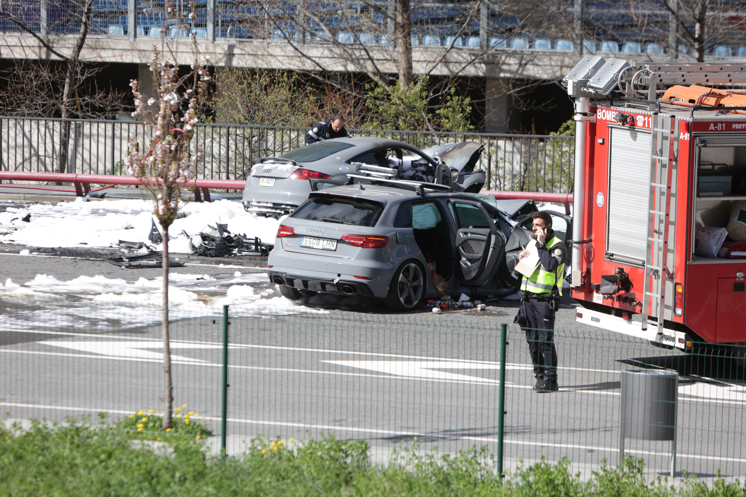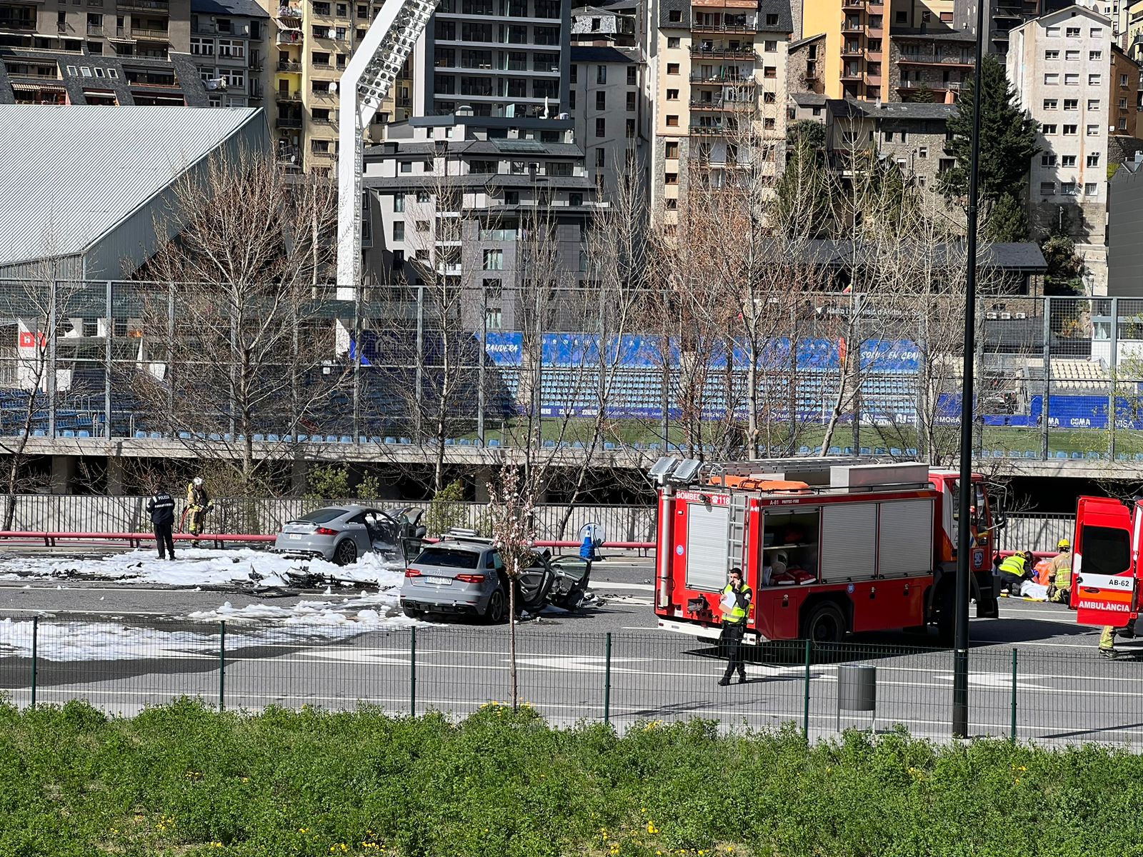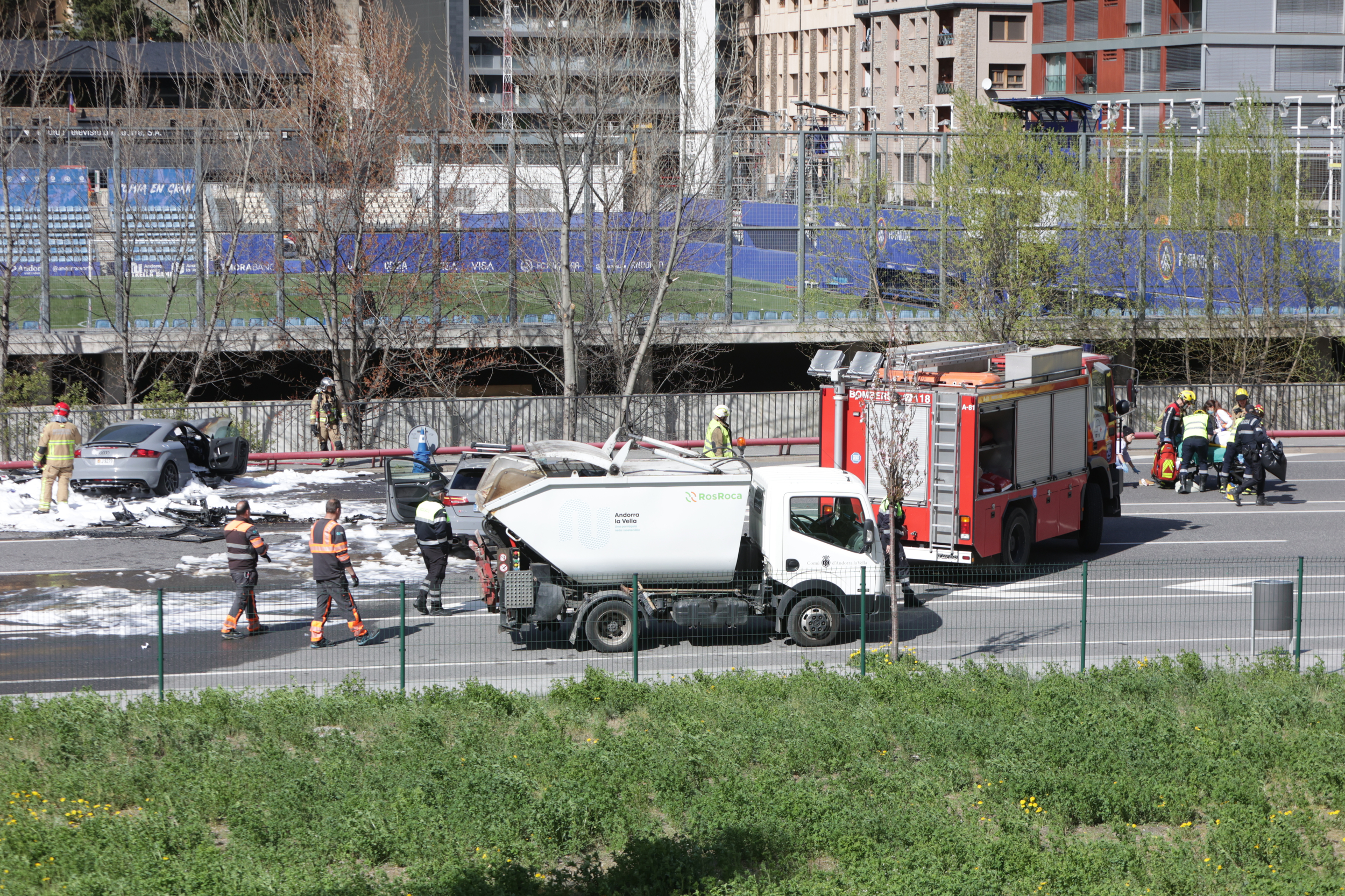 Fins al lloc dels fets s’hi han desplaçat una dotació dels Bombers, quatre ambulàncies, tres del Servei d’Urgències Mèdiques (SUM) i una dels Bombers, i diferents patrulles de la policia i el Servei de Circulació d’Andorra la Vella. Han estat necessaris dos petits camions del servei de neteja per retirar de la calçada l’escuma contra el foc.