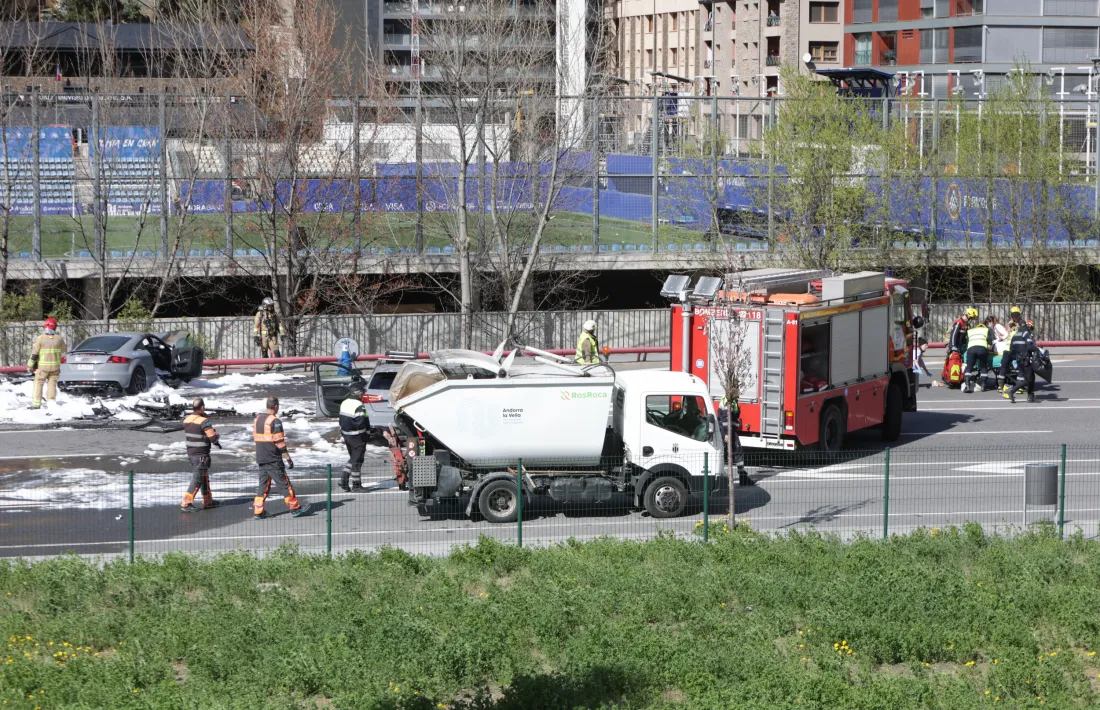 En l’accident s’hi han vist implicats un Audi TT amb matrícula andorrana que anava en direcció nord, i un Audi RS3, amb placa espanyola, que es dirigia cap al sud –en cada vehicle hi viatjaven dues persones–. Tal com han explicat alguns testimonis, els cotxes haurien col·lidit violentament per causes que encara es desconeixen i el TT s'ha incendiat parcialment, fet que ha generat una forta columna de fum i una gran expectació entre els vianants a la zona. Han estat els mateixos vianants, segons han apuntat les fonts consultades, els que han ajudat a sortir el conductor de l’interior del cotxe incendiat.