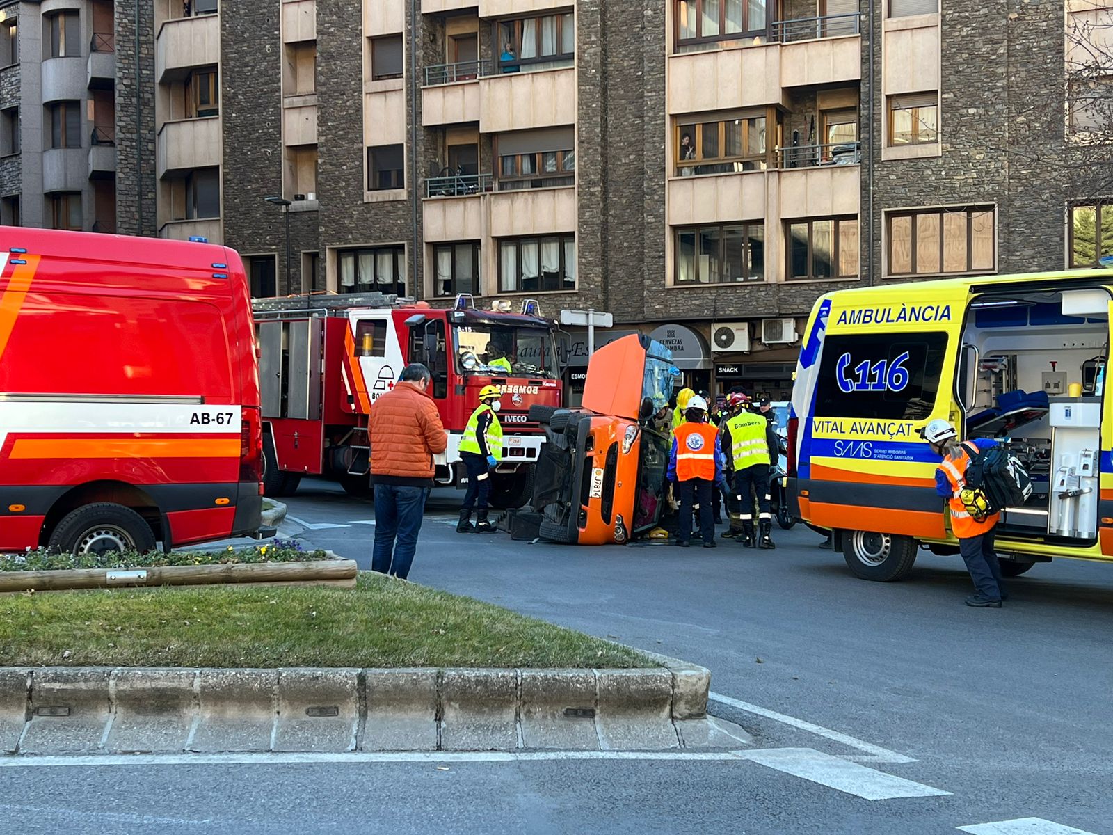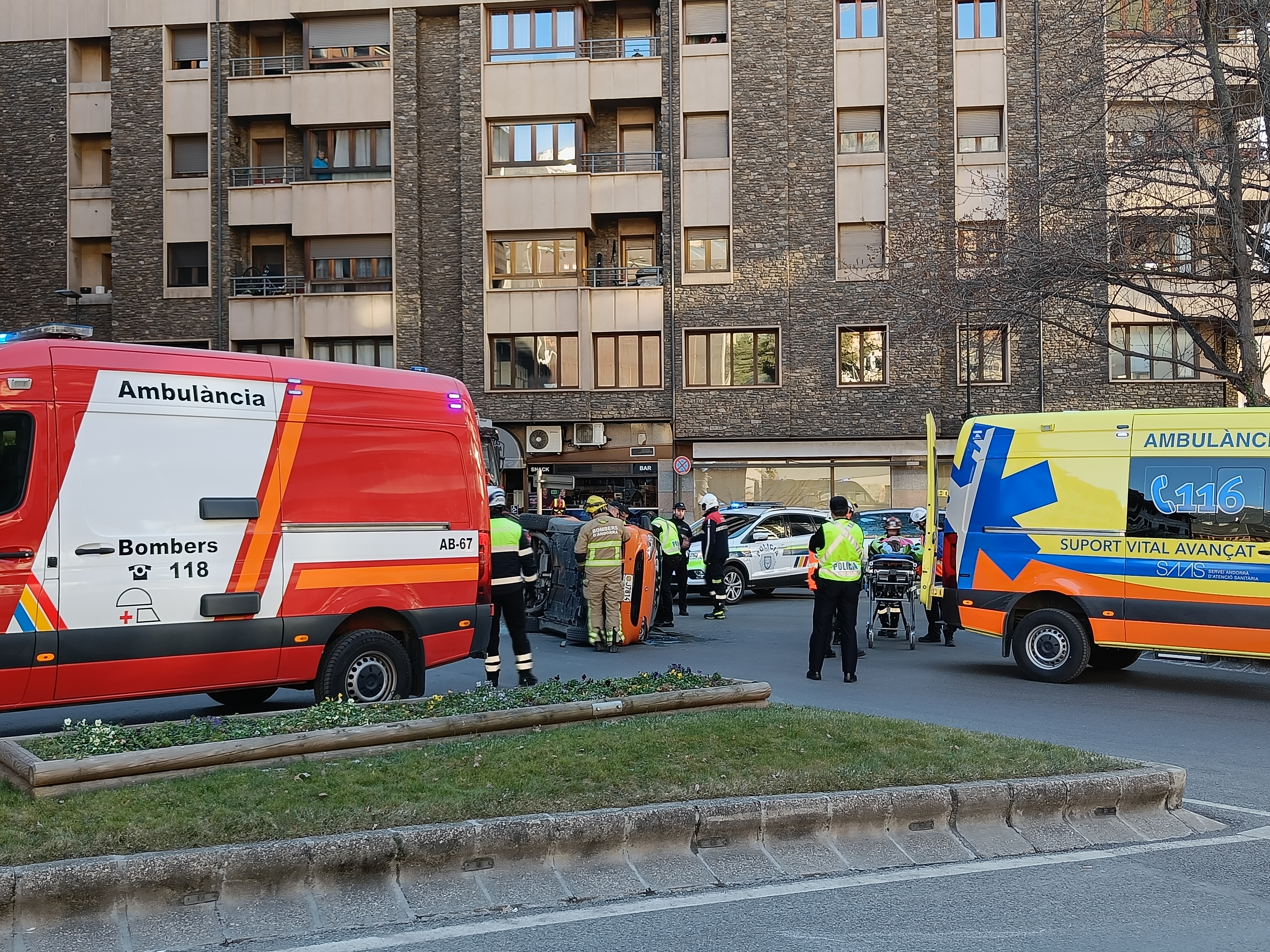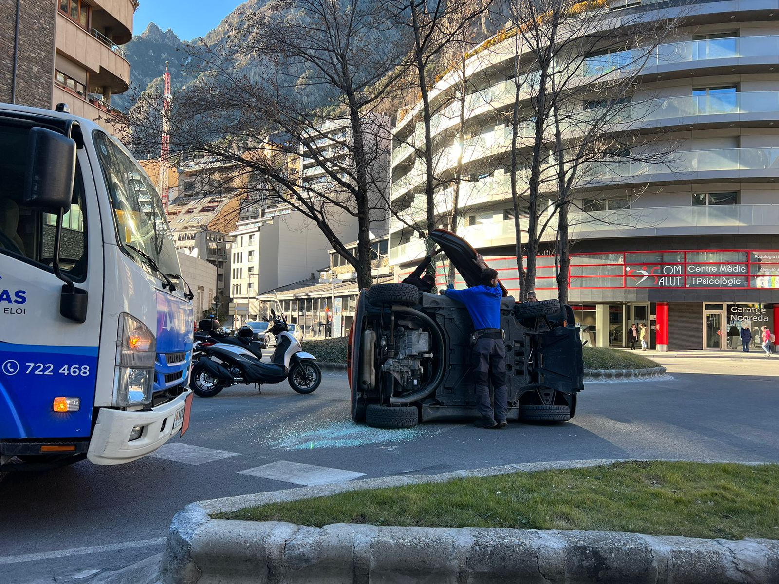 Un vehicle ha bolcat aquesta tarda a la rotonda de Tobira. L'accident s'ha produit a les 16.14 hores de la tarda i s'hi ha vist implicat un sol cotxe, un Smart Fortwo que ha quedat bolcat per la banda del conductor al bell mig de la rotonda. La conductora i única ocupant del vehicle, una dona de 75 anys i resident al país, ha hagut de ser excarcerada pels bombers però no ha patit ferides greus.