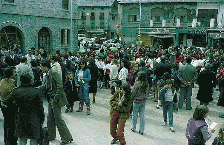 Andorra la Vella, 1981: la plaça Rebés exercint d’espai públic. Atenció al fons, a la plaça Benlloch, que era encara aparcament i vedat dels vehicles.