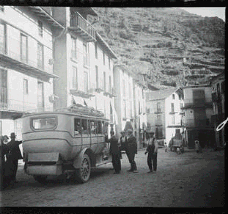 Sant Julià de Lòria, 1921: la plaça Major, amb el cotxe de línia de la Seu. Ja s’havia enderrocat la casa Vianya però queden cal Patau, a l’esquerra, i cal Calderé.